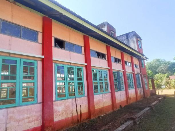 These two photos were taken in January 2025 in At--- village, K’Ter Tee village tract, Dwe Lo Township, Mu Traw District. The left photo shows an assembly hall, and the right photo shows the glass window of a church that were damaged by an SAC air strike on December 31st 2024, at 4 pm in At--- village. [Photo: KHRG]