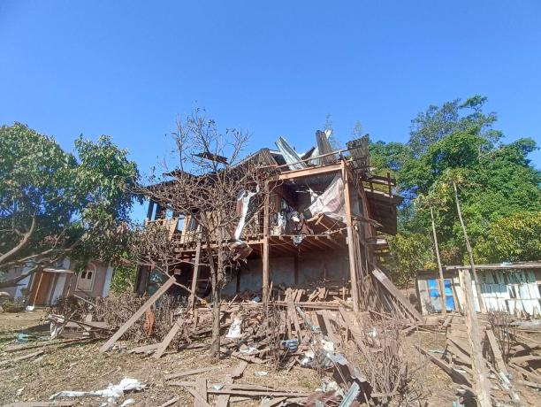 The photo on the left was taken in January 2024, at 9 am, in Ae--- village, Day Loh Mu Nu village tract, Htaw Ta Htoo Township (Htantabin), Taw Oo District. The photo shows the inside of a house owned by a villager named A--- that was damaged by an SAC air strike on January 4th 2024. [Photo: KHRG]