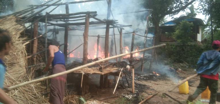 This photo was taken in March 2024 in Bf--- village, near Bg--- village, Kaw T’Ree (Kawkareik) Township, Dooplaya District. The photo shows the burnt remains of the houses of villagers after the SAC dropped bombs on Bf--- on March 5th 2024. [Photo: KHRG]