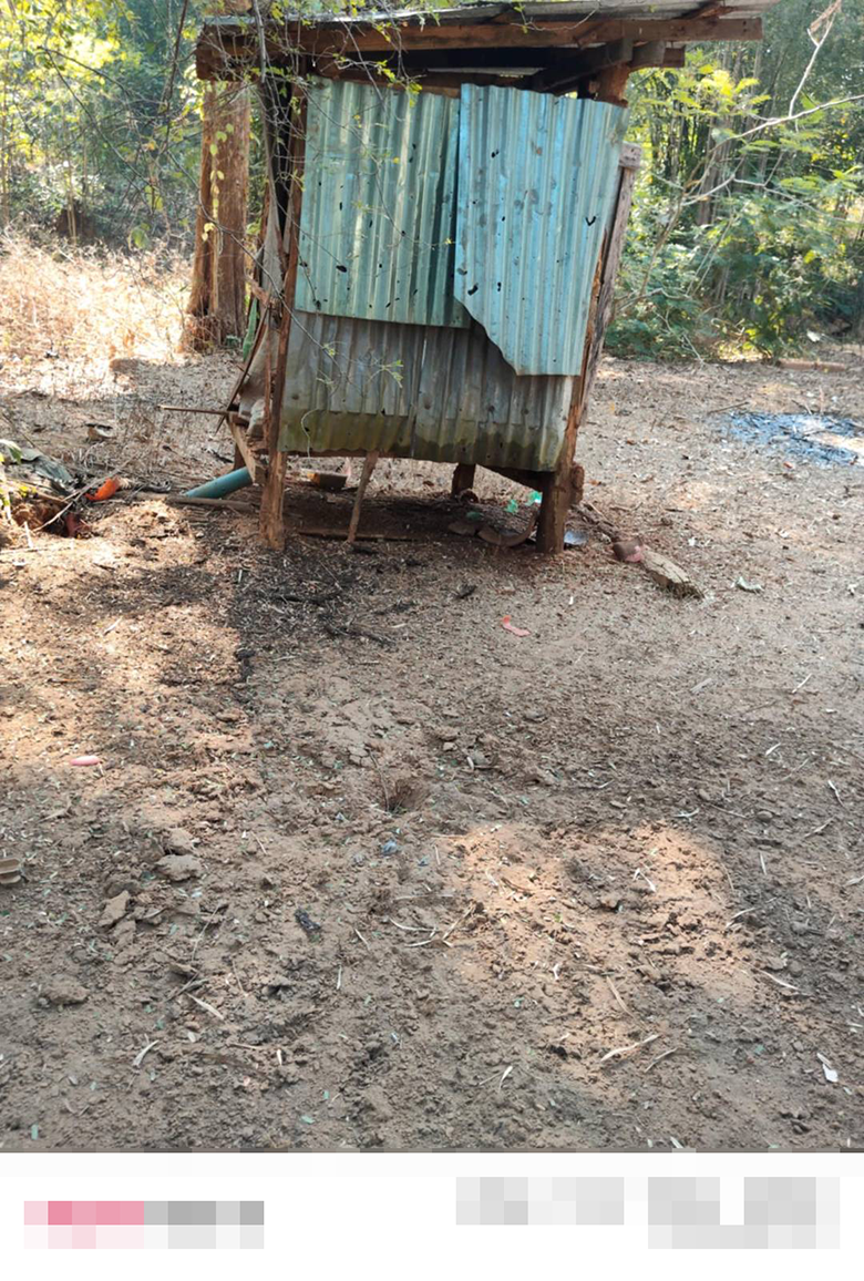 On February 3rd 2026, at around 10 am, two 60 mm shells believed to be fired by the Burma Army landed and exploded inside Ac--- village, P’Shaw Loh village tract, Daw Hpah Hkoh Township, Taw Oo District. The photo on the left shows a villager named Naw B---, 38 years old, who was hit by shrapnel from one of the shells on her throat and died on the spot. The photo on the right shows Naw B---’s toilet walls, which were also hit by one of the shells. Villagers believe that the shells were fired from Ae--- village, P’Shaw Loh village tract. [Photos: Local villager]