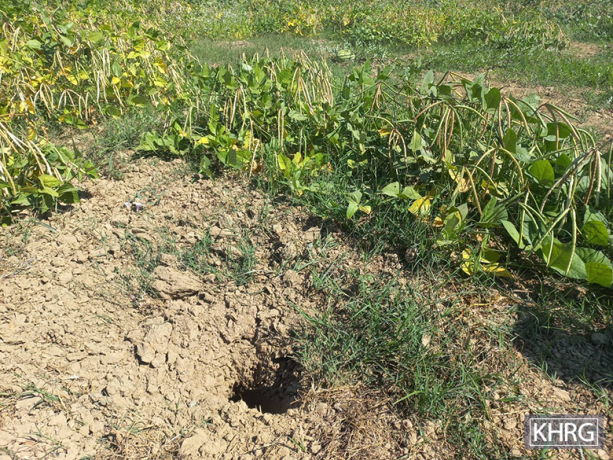 On December 28th 2025, the Burma Army, based in Nan Thar Kwin Town, Moo Township, Kler Lwee Htoo District, fired two shells, and the shells landed and exploded in a plantation field, located near Aa--- village, Moo special area, Moo Township, owned by a local villager named Maung A---. The shelling injured Maung A---’s left leg. The photo shows a hole in the plantation field where one of the shells landed. [Photo: KHRG]