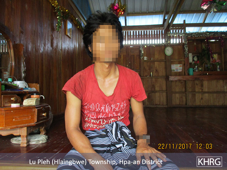 ဤဓာတ်ပုံကို ၂၀၁ရခုနှစ်၊ နိုဝင်ဘာလ၊ ၂၂ရက်တွင် ဖားအံခရိုင် လှိုင်းဘွဲမြို့နယ်၊ ဧ---မြို့အနီးရှိ ဧ---ဒေသတွင် ရိုက်ယူခဲ့သည်။ ပုံတွင် BGF လမ်းပြအဖြစ် စေခိုင်းခံခဲ့ရသည့် ရွာသားတစ်ဦး ဖြစ်သည့် စောင---၏ ပုံဖြစ်သည်။ ကရင်လူ့အခွင့်အရေးအဖွဲ့ သတင်းမှတ်တမ်း ပြစုသူတစ်ဦးသည စောန---အား ၂၀၁ရခု နှစ်၊ နိုဝင်ဘာလ၊ ၂၂ရက်တွင် တွေ့ဆုံမေးမြန်းနေစဉ်တွင် သူသည် နှစ်လနီးပါး BGF လမ်းပြတစ် ယောက်အဖြစ် BGF အရာရှိ များဖြစ်သော မောင်နနှင့် နဲဝါးတို့၏ အတင်းအဓမ္မခိုင်း စေခဲ့ခြင်းနှင့်ပတ်သက်၍ ၎င်း၏ ဖြတ်သန်းမှုအတွေ့အကြုံများကို ပြောဆိုထုတ်ဖော်ခဲ့သည်။ [ဓာတ်ပုံ - KHRG]