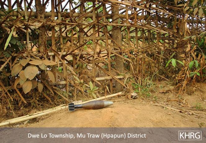 အထက်ပါပုံများသည် ၂၀၁၈ ခုနှစ် မတ်လ ၂၈ရက်နေ့ ဖာပွန်ခရိုင်၊ ဒွယ်လိုးမြို့နယ်၊ လေးဖိုးထကျေးရွာအုပ်စု၊ င--- ရွာ အနီးနားတွင် ရိုက်ယူခဲ့သည်။ ပုံတွင် ၂၀၁၈ ခုနှစ် မတ်လ ၁၅ရက်နေ့တွင် တပ်မတော် ခြေမြန်တပ်မ အမှတ်(၂၂) လက်အောက်ခံ ခြေမြန်တပ်ရင်း အမှတ် (၂၀၃) ခြေမြန််တပ်ရင်း အမှတ် (၂၀၃) နှင့် KNLA တပ်ရင်းအမှတ် (၁၀၂) လက်အောက်ခံ KNLA တပ်ခွဲအမှတ (၃) ကြား တိုက်ပွဲများဖြစ်ပွားနေသည့်အချိန်တွင် တပ်မတော်ဖက်က ပစ်ခတ် ခဲ့သော မပေါက်ကွဲသေးသည့် ၈၁မမ လက်နက်ကြီး ကျည်ဆံတစ်လုံး၏ပုံဖြစ်သည်။ (ဓာတ်ပုံများ - KHRG)