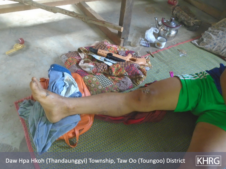 ဤဓါတ်ပုံအား ၂၀၁၉ခုနှစ်၊ မေလ၊ ၁၂ ရက်နေ့ တောင်ငူခရိုင်၊ သံတောင် ကြီးမြို့နယ်၊ န--- ရွာတွင် ရိုက်ယူခဲ့ခြင်းဖြစ်သည်။ ဤပုံသည် တပ်မတော် ကားနှင့်တိုက်မိပြီး ဒဏ်ရာရရှိခဲ့သော စောတ---၏ခြေထောက်ပုံအား ဖေါ်ပြထားပါသည်။ (ဓာတ်ပုံ- KHRG)