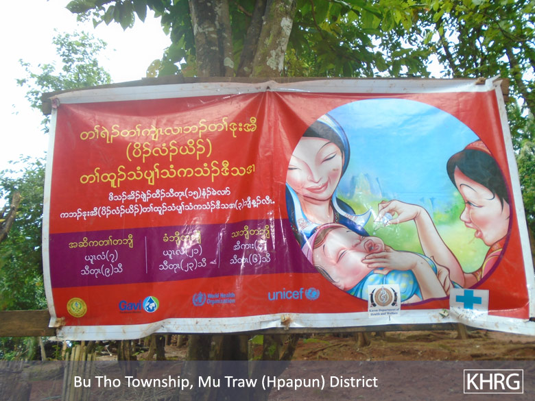ဤပုံကို ၂၀၁၉ခုနှစ်၊ သြဂုတ်လ ၉ရက်နေ့တွင် ဘူးသိုမြို့နယ်၊မဲက လောကျေးရွာအုပ်စု၊ ကလောဒေးကျေးရွာတွင် ရိုက်ယူခဲ့ပါသည်။ KDHW မှကလေးများအား ပိုလီယိုရောဂါကာကွယ်ဆေးထိုးရန်အ တွက် ကပ်ထားသောကြော်ငြာဖြစ်ပါသည်။ [ဓာတ်ပုံ - KHRG]