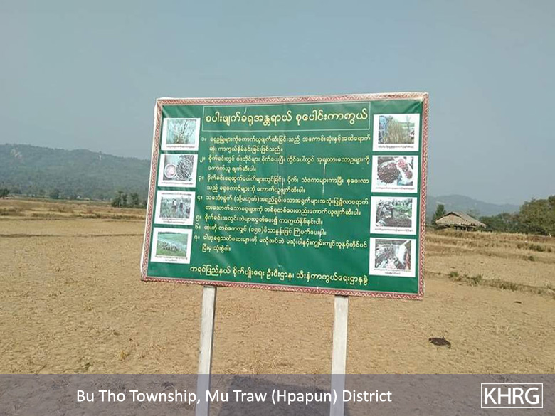 ဤပုံကို ၂၀၁၉ခုနှစ်၊ ဇူလိုင်လ ၃၁ရက်နေ့တွင် မူတြော်ခရိုင်၊ ဘူးသိုမြို့နယ်၊ မယ်ကလောကျေးရွာအုပ်စုတွင် ရိုက်ယူခဲ့ပါသည်။ ကရင်ပြည်နယ်လယ်ယာစိုက်ပျိုးရေးဝန်းကြီးဌာနမှ ပိုးနှင့်ကြွက်များ အားမည်ကဲ့သို့သတ်ရမည့်အသိပညာပေးခြင်းဆိုင်းဘုတ်ကို လယ် ကွင်းတစ်နေရာ၌စိုက်ထူထားသည့်ပုံဖြစ်ပါသည်။ [ဓာတ်ပုံ - KHRG]