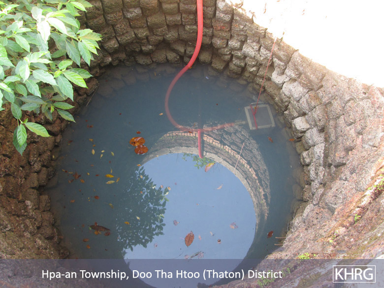 ဤဓါတ်ပုံများသည် ၂၀၁၉ခုနှစ်၊ အောက်တိုဘာလ ၃၁ရက်နေ့ သထုံခရိုင်၊ ဘားအံမြို့နယ်၊ ယ---ရွာတွင်ရိုက်ကူးခဲ့ပါသည်။ လက်ဝဲဘက်ရှိ ဓါတ်ပုံမှာ ကရင်ပြည်နယ်ဝန်ကြီး နန်းခင်ထွေးမြင့်နှင့်သူမ၏အဖွဲ့များသည် ရေများအားလာရောက်ရှင်းခဲ့သော်လည်း ရေတွင်းရှိရေများသည် အရောင်မည်းနေဆဲကိုဖော်ပြထားပါသည်။ ထို့ကြောင့် ဒေသခံများမှထိုရေများသုံးရန်ကြောက်ရွံ့၍ အခြားသောရေအလှူရှင်များမှ မှီခိုရခြင်း ဖြစ်သည်။ လက်ယာဘက်ရှိဓါတ်ပုံမှာ ရွာသားများမှလမ်းဘေးတွင် လှူသောရေများအားစောင့်နေခြင်းကို ဖော်ပြထားပါသည်။ [ဓါတ်ပုံ - KHRG]