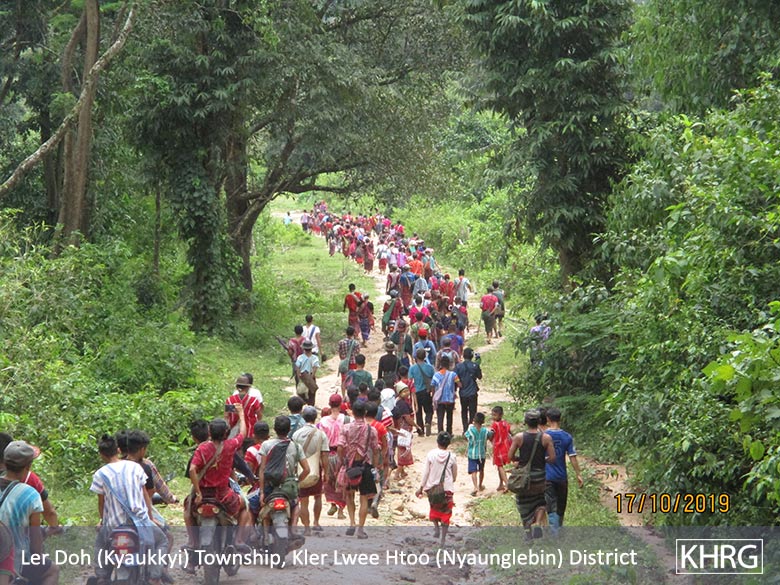 ဤပုံနှစ်ပုံမှာ ၂၀၁၉ခုနှစ် အောက်တိုဘာလ ၁ရရက်နေ့တွင် ခလယ်လွီထူခရိုင်၊ လယ်ဒိုမြို့နယ်၊ ဃဲဒဲကျေးရွာအုပ်စုတွင်ရိုက်ယူခဲ့ပါသည်။ ရွာသား ၃၉၃ဦးမှ ၎င်းတို့ဒေသတွင် တပ်မတော်မှဆောက်လုပ်သောလမ်းအားရပ်တန့်ရန်ပြုလုပ်သော ငြိမ်းချမ်းသောဆန္ဒပြပွဲအား ဖော်ပြ ထားသည်။ [ဓါတ်ပုံ - KHRG]