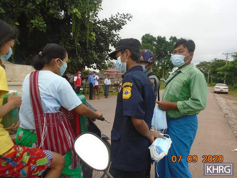 မြန်မာအစိုးရနှင့်ကျန်းမာရေးဝန်ထမ်းများမှလမ်းပေါ်တွင် သွားလာ နေသူများကိုနှာခေါင်းစည်းများ ဝေပေးနေပုံဖြစ်ပါသည်။(ဓာတ်ပုံ- KHRG)