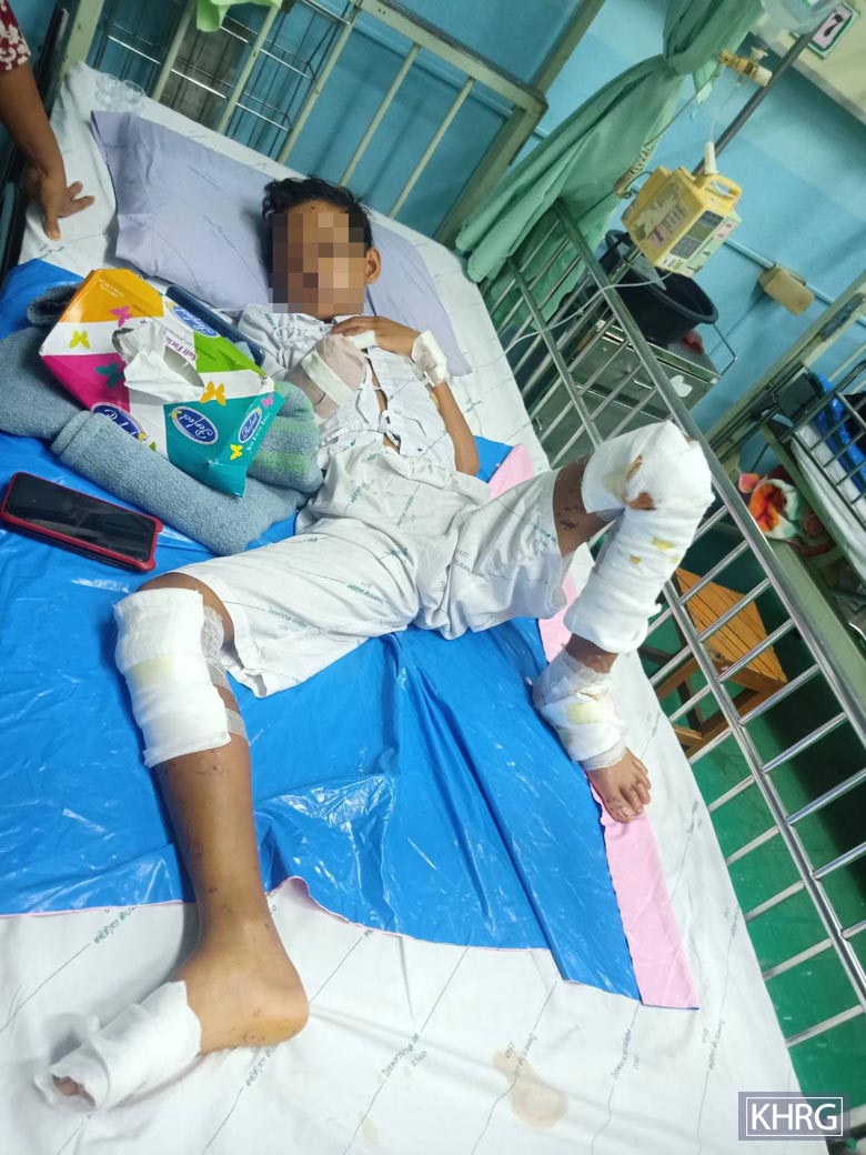 ပုံမှာ ဆေးရုံကုတင်တွင် လှဲလျောင်းနေသော စောဟ---၏ပုံဖြစ် သည်။ UXO ပေါက်ကွဲမှုကြောင့် စောဟ---၏ယာဘက်လက်သည် ပြတ်ထွက်သွားခဲ့ပြီး ဦးခေါင်း၊ မျက်နှာနှင့် ခြေထောက်တွင်လည်း ဒဏ်ရာရရှိခဲ့သည်။ (ဓာတ်ပုံ- KHRG)
