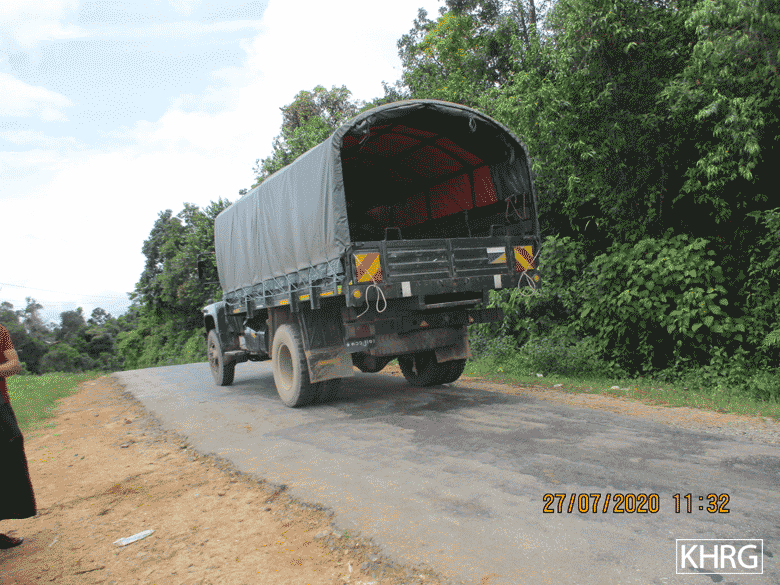 ဘယ်ဘက်တွင်ရှိသောဓာတ်ပုံကို ၂၀၂၀ ခုနှစ်၊ ဇူလိုင်လ ၂၇ ရက်နေ့ တောအူးခရိုင်၊ သံတောင်ကြီးမြို့နယ်၊ လိပ်သိုမြို့တွင်ရိုက်ယူခဲ့ပါသည်။ ပုံ တွင်တွေ့ရသောစစ်ကားသည် တောင်ငူမြို့မှ ယာဒိုမြို့သို့ စစ်သားများနှင့်ရိက္ခများသယ်လာသော ကားအစီး ၂၀ ထဲမှတစ်စီးဖြစ်ပါသည်။ ညာ ဘက်တွင်ရှိသောဓာတ်ပုံကို ၂၀၂၀ ခုနှစ်၊ ဇူလိုင်လ ၃၁ ရက်နေ့ တောအူးခရိုင်၊ တောင်ငူမြို့နယ်၊ ၅ မိုင်ရွာတွင်ရိုက်ယူခဲ့ပါသည်။ ဘောဂလိရှိ ရှေ့ တန်းစခန်းများသို့ စစ်သားများသွားပို့ပြီး ပြန်လာသောကားတစ်စီးဖြစ်ပါသည်။ ထိုကဲသို့စစ်သားပြောင်းလဲမှုများသည် ၃ လ ၁ ကြိမ်ပြုလုပ်လေ့ ရှိသည်။ (ဓာတ်ပုံ- KHRG)
