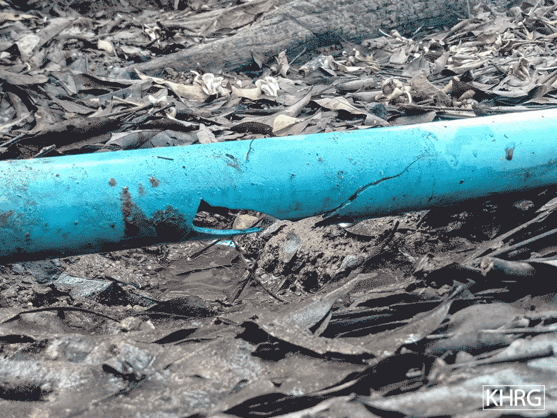 ခမရ အမှတ် (၄၀၂) မှ လက်နက်ကြီးရမ်းသမ်းပစ်ခတ်မှုကြောင့် ဒေ သခံများ၏စိုက်ခင်းများ၊ နေအိမ်များနှင့် ရေပိုက်များပျက်စီးခဲ့ပုံများ ဖြစ်ပါသည်။(ဓာတ်ပုံ- KHRG)