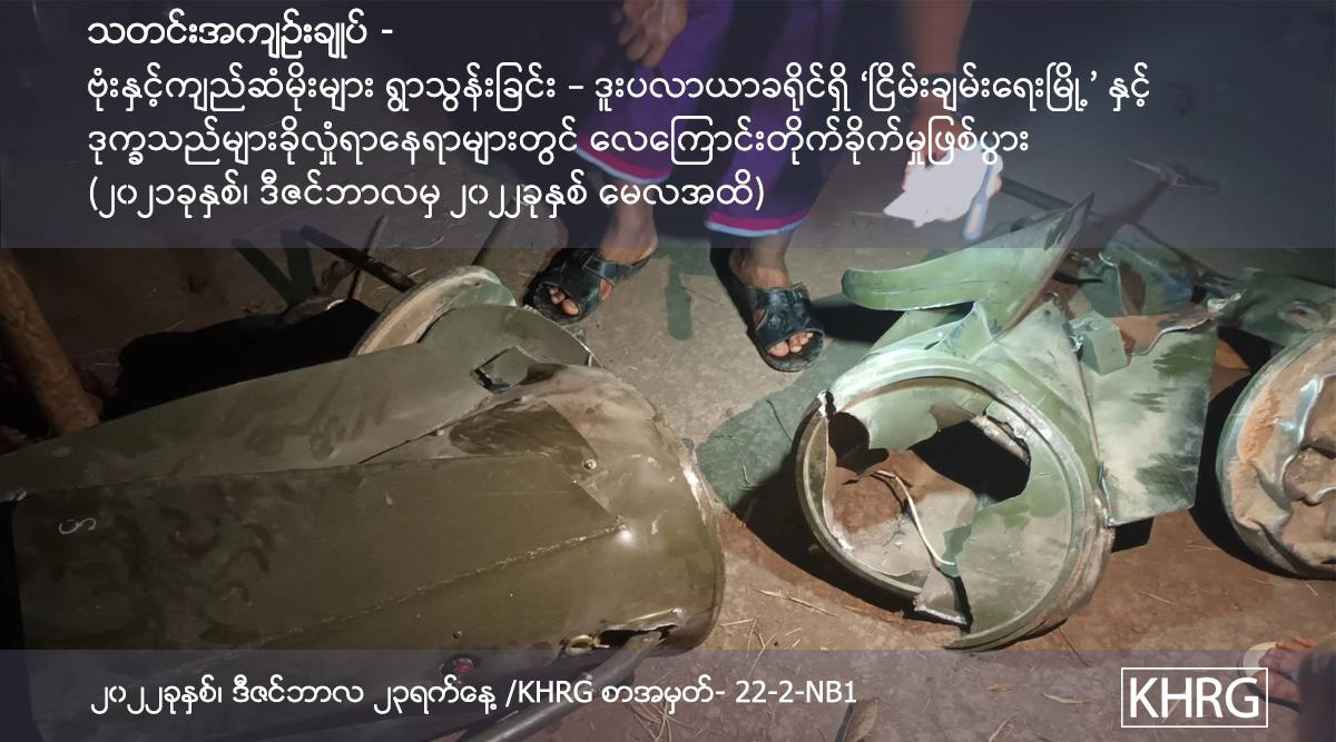 KHRG မှ လက်ခံရရှိသည့်သတင်းအချက်အလက်များအရ ဒေသခံပြည်သူများမှ ဗုံးနှစ်လုံးကို တွေ့ရှိခဲ့ပြီး တစ်လုံးမှာ မပေါက်ကွဲဘဲရှိနေသည်။ အဆိုပါဗုံးများသည် ဓာတုဗုံးလက်နက်များဖြစ်ကြောင်း ဒေသခံများ ယူဆကြသည်။ အဘယ်ကြောင့်ဆိုသော် တစ်ချို့ရွာသားများသည် အခြေအနေကိုသိချင်သောအားဖြင့် ဗုံးကြဲခဲ့သည့်နေရာတွင် သွားကြည့်ရာတွင် ဆိုးရွားသည့်ရောဂါလက္ခဏာများကို ရရှိခဲ့ခြင်းကြောင့်ဖြစ်သည်။ ဗုံးကျခဲ့သည့်နေရာတွင် သွားရောက်စစ်ဆေးကြသည့် ရွာသားများသည် အမျိုးမျိုးသော ရောဂါလက္ခဏာများ ကြုံတွေ့ခဲ့ရသည်။ ထိုရောဂါ လက္ခဏာများကို ခံစားခဲ့ရသည့် ရွာသားတစ်ဦးမှ KHRG အား ဤသို့ရှင်းပြခဲ့သည်။ “ကျွန်တော့်မျက်လုံးတွေက ပူစပ်စပ်ဖြစ်နေတာကို ခံစားရတယ်။ […ဒါပေမဲ့] တခြားသူတွေက အော့အန်တယ်။ ပြီးတော့ မူးဝေတယ်။ သူတို့မျက် လုံးတွေ ပူစပ်စပ်ခံစားရတာကို ကျွန်တော်မြင်ခဲ့ရတယ်။ […] အဲလိုရောဂါလက္ခဏာမျိုးကို ခံစားနေရတဲ့ရွာသား (၇)ဦးလောက် ရှိတယ်။ ဒါပေမဲ့ သူတို့ထဲက နှစ်ဦးကတော့ တော်တော်လေးခံစားခဲ့ရတယ်။ ဘာဖြစ်လို့လဲဆိုတော့ သူတို့အသက်တောင် မရှုနိုင်ဘူးတဲ့။” ထိုဗုံးများသည် အမှန်တကယ် ဓာတုလက်နက်ဟုတ်မဟုတ် KHRG မှ အတည် မပြုနိုင်သေးပါ။ ထိုဗုံးများကို မြင်တွေ့ခဲ့သူများ၏ ပြောပြချက်အရ ဗုံးတစ်လုံးတွင် နံပါတ် (၁၅)ဖြင့်တံဆိပ် တပ်ထား ပြီး ကျန်သောဗုံးတစ်လုံးမှာ နံပါတ် (၁၈)ဖြင့် တံဆိပ်တပ်ထားကြောင်း သိရှိရသည်။ ဒေသခံရွာသားများ၏ပြောကြား ချက်အရ မပေါက်ကွဲသေးသော ဗုံးတစ်လုံးမှာ အမည်မသိအဖွဲ့တစ်ဖွဲ့မှ ဖယ်ရှားခဲ့ပြီး မြေမြှုပ်မိုင်းတစ်လုံးကို ၎င်းနေ ရာတွင် ထားရှိခဲ့သည်။