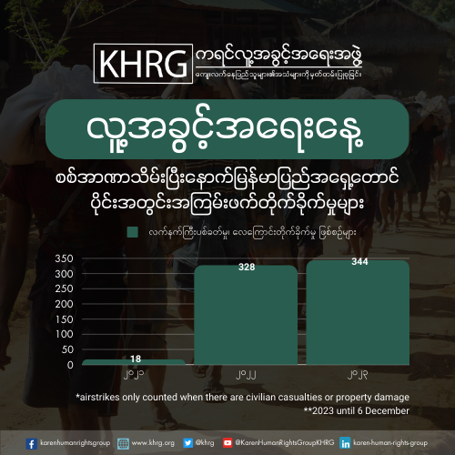 စစ်ကောင်စီအနေဖြင့် ၂၀၂၃ ခုနှစ် အာဏာသိမ်းပြီးကတည်းက လက်နက်ကြီးရမ်းသမ်းပစ်ခတ်မှုများနှင့် လေကြောင်းတိုက်ခိုက်မှုများကို နိုင်ငံတဝှမ်းလုံးတွင် အရှိန်အဟုန်မြင့်တိုက်ခိုက်ခြင်းများ ပြုလုပ်နေပါသည်။ ထိုတိုက်ခိုက်မှုများကြောင့် အရပ်သားပြည်သူများ ထိခိုက်ဒဏ်ရာရရှိစေပြီး ထိခိုက်သေဆုံးမှုများဖြစ်ပေါ်စေပါသည်။ ထို့ အပြင် အဆိုပါတိုက်ခိုက်မှုများကြောင့် ကျောင်းများ၊ ဆေးခန်းများ၊ ဆေးရုံများနှင့် ဘာသာရေးအဆောက်အဦးများ အပါအဝင် အရေးကြီးသောအများပိုင်အဆောက်အဦးများလည်း ထိခိုက်ပျက်စီးခဲ့ပါသည်။ KHRG ၏ မှတ်တမ်း များအရ ယခု ၂၀၂၃ ခုနှစ် တစ်နှစ်တည်းတွင် မြန်မာစစ်တပ်သည် မြန်မာပြည်အရှေ့တောင်ပိုင်းတွင် အနည်းဆုံး လေကြောင်းတိုက်ခိုက်မှု (၉၅) ကြိမ်ထက်မနည်းပြုလုပ်ခဲ့ပြီး အရပ်သားထိခိုက်သေဆုံးသူနှင့် ဒဏ်ရာရရှိသူစုစုပေါင်း (၁၃၄) ဦးထက်ပို၍ရှိခဲ့ပါသည်။ ထို့အပြင် ၎င်းတို့သည် လက်နက်ကြီးပစ်ခတ်မှု (၂၄၉) ကြိမ်ပြုလုပ်ခဲ့ပြီး အရပ်သားထိခိုက်သေဆုံးသူနှင့် ဒဏ်ရာရရှိသူစုစုပေါင်း (၃၈၄) ဦးထက်မနည်း ရှိခဲ့သည်။ ဤသို့ အရပ်သားများအပေါ် ဆက်လက်ဖြစ်ပွားနေသော လူ့အခွင့်အရေးချိုးဖောက်မှုများနှင့် လက်နက်ကိုင်ပဋိပက္ခများသည်လည်း အရပ်သားများကို အစုလိုက်အပြုံလိုက်ထွက်ပြေးတိမ်းရှောင်နေရမှုနှင့် နေရပ်ရွှေ့ပြောင်းနေထိုင်ရမှုများတိုးပွားလာစေကာ နိုင်ငံအတွင်း လူသားချင်းစာနာထောက်ထားမှုဆိုင်ရာ အကျပ်အတည်းများဖြစ်စေပါသည်။ တချိန်တည်းတွင် စစ်ကောင်စီသည် မြန်မာပြည်အရှေ့တောင်ပိုင်းရှိ ဒေသအများအပြားတွင် အသက်ကယ်ဆယ်ရေး လူသားချင်းစာ နာထောက်ထားမှုဆိုင်ရာ ထောက်ပံ့ကူညီမှုများပြလုပ်ရန်ကိုငြင်းပယ်ခြင်း၊ ကူညီကယ်ဆယ်ရေး လုပ်ဆောင်မှုများ ကို တားဆီးပိတ်ပင်ခြင်းနှင့် လူသားချင်းစာနာထောက်ထားမှုအကူအညီများ သိမ်းယူခြင်းများကို လုပ်ဆောင်နေ ဆဲဖြစ်ပါသည်။
