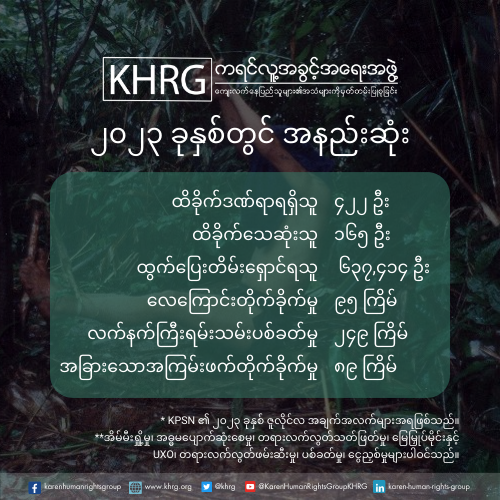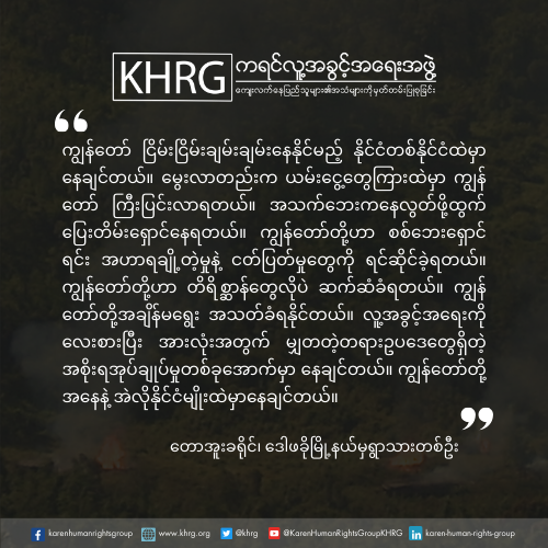 ယနေ့ကျရောက်သော အပြည်ပြည်ဆိုင်ရာလူ့အခွင့်အရေးနေ့တွင် ကျွန်ုပ်တို့ ကရင်လူ့အခွင့်အရေးအဖွဲ့(KHRG) သည် လူ့အခွင့်အရေးမြှင့်တင်ကာကွယ်ရန်အတွက် မယိမ်းယိုင်သောကတိကဝတ်များကို ထပ်မံအတည်ပြုပြီး မြန်မာပြည်သူများနှင့် အတူအကွ ရပ်တည်နေပါသည်။ ယနေ့အချိန်အခါထိ နိုင်ငံတော်စီမံအုပ်ချုပ်ရေးကောင်စီ (SAC) ၏ဦးဆောင်မှုအောက်ရှိမြန်မာစစ်တပ်သည် နိုင်ငံတစ်ဝှမ်းတွင် စစ်ရာဇ၀တ်မှုများ၊ လူသားမျိုးနွယ်အပေါ် ကျူးလွန် သည့်ရာဇ၀တ်မှုများနှင့် အခြားသောလူ့အခွင့်အရေးချိုးဖောက်မှုများကို ပုံစံအမျိုးမျိုးဖြင့် ပြစ်ဒဏ်ပေးခံရမှုလုံးဝမရှိဘဲ ဆက်လက်ကျူးလွန်နေဆဲဖြစ်ပါသည်။ လူ့အခွင့်အရေးချိုးဖောက်မှုများအပေါ် မြန်မာပြည်သူများ၏ရုန်းကန်နေရမှုများနှင့် ထိုချိုးဖောက်မှုများအားခုခံတွန်းလှန်ရာတွင် ၎င်းတို့၏ခံနိုင်ရည်ရှိမှုများအပေါ် အသိအမှတ်ပြုသောအနေဖြင့် ကျွန်ုပ်တို့သည် နိုင်ငံတကာအသိုင်းအဝိုင်းများအား မြန်မာပြည်၏ ဆိုးရွားလှသော လူ့အခွင့်အရေးချိုး ဖောက်မှုအခြေအနေများကိုအာရုံစိုက်စေလိုပြီး စစ်ကောင်စီများ၏ ရက်စက်ကြမ်းကြုတ်သောလုပ်ရပ်များအားအ ဆုံးသတ်စေရေးအတွက် ပူးပေါင်းလုပ်ဆောင်ကြပါရန် တောင်းဆိုလိုက်ပါသည်။