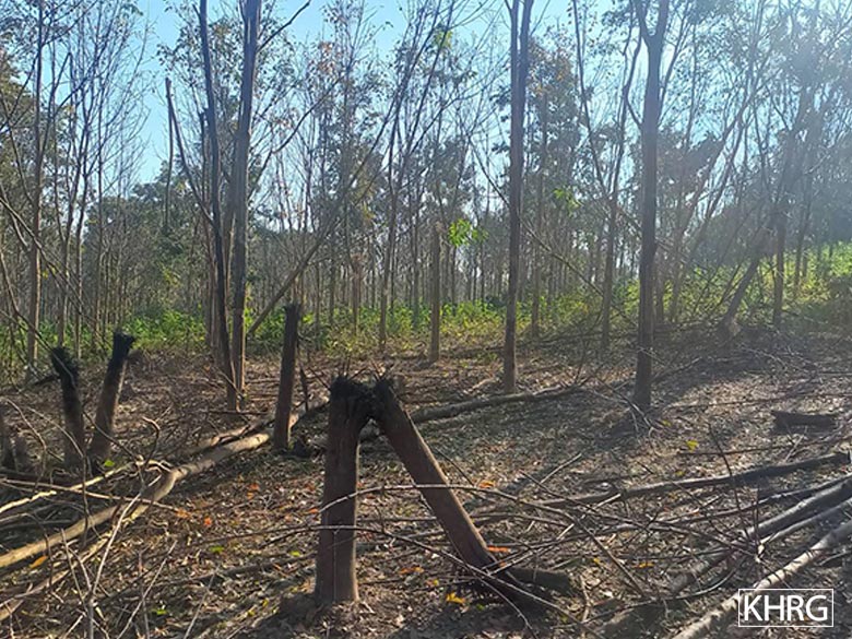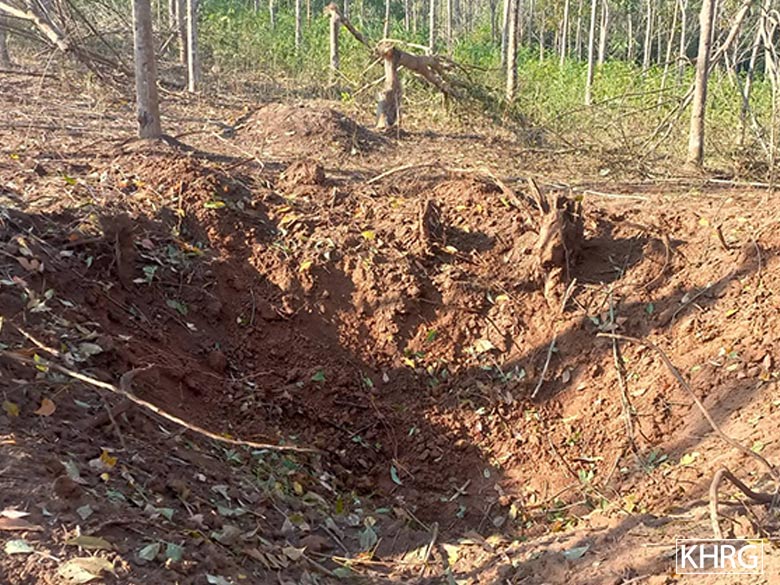 ဤဓာတ်ပုံများကို ၂၀၂၅ ခုနှစ်၊ ဇန်နဝါရီလအတွင်း ဒူးသထူခရိုင်၊ ဘားအံမြို့နယ်၊ အီဟယ်ရွာကြီးအုပ်စု၊ အသ--- ကျေးရွာအနီး နော်န--- ၏ ရာဘာခြံထဲတွင် ရိုက်ယူခဲ့သည်။ ပုံတွင် စစ်ကောင်စီဂျက်လေယာဥ်တစ်စီးမှ ပေါင် (၅၀၀) ဗုံးနှစ်လုံးပစ်ချ၍ ရာဘာခြံထဲတွင် ကျရောက်ပေါက် ကွဲပြီး ရောဘာပင်များပျက်စီးသွားသောအခြေအနေကို ဖော်ပြထားသည်။ (ဓာတ်ပုံ- KHRG)