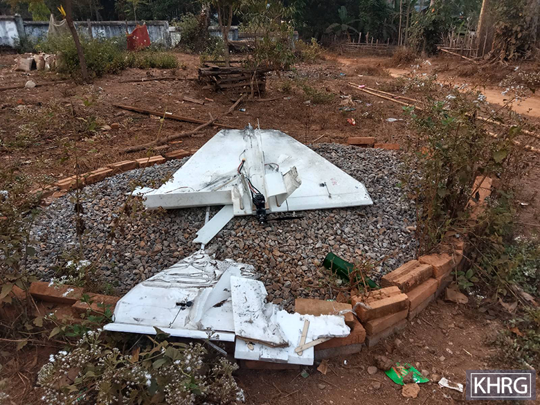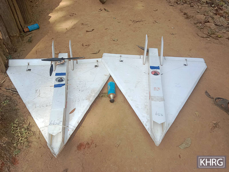 ဤဓာတ်ပုံများကို ၂၀၂၅ ခုနှစ်၊ ဇန်နဝါရီလအတွင်း ဒူးသထူခရိုင်၊ ဘီးလင်းမြို့နယ်၊ တာအူးခီးကျေးရွာအုပ်စု၊ အင--- ကျေးရွာတွင် ရိုက်ယူခဲ့သည်။ ပုံတွင် ကျေးရွာအတွင်း စစ်ကောင်စီကာမီကာဇေဒရုန်းများဝင်ရောက်တိုက်ခိုက်၍ ကျန်ရှိခဲ့သောအခြေအနေကိုဖော်ပြထားသည်။ ဘယ်ဘက်ပုံ သည် ရွာသားများတွေ့ရှိခဲ့သော ကာမီကာဇေဒရုန်းနှစ်စီးဖြစ်သည်။ ဒရုန်းတစ်စီးသည် ကျေးရွာအတွင်းထိုးကျပြီး အခြားဒရုန်းတစ်စီးသည် ကျေး ရွာအပြင်ဖက်တွင် ထိုးကျခဲ့သည်။ ညာဘက်ပုံသည် စစ်ကောင်စီဒရုန်းတစ်စီးသည် စာသင်ကျောင်းအနီးနား ဘုန်းကြီးကျောင်းဝင်းထဲတွင် ကျ ရောက်ပေါက်ကွဲခဲ့သည့်အခြေအနေကို ဖော်ပြထားသည်။ (ဓာတ်ပုံ- KHRG)