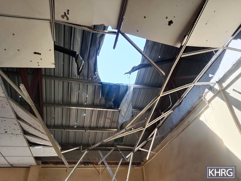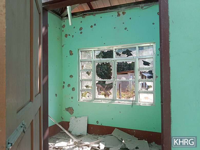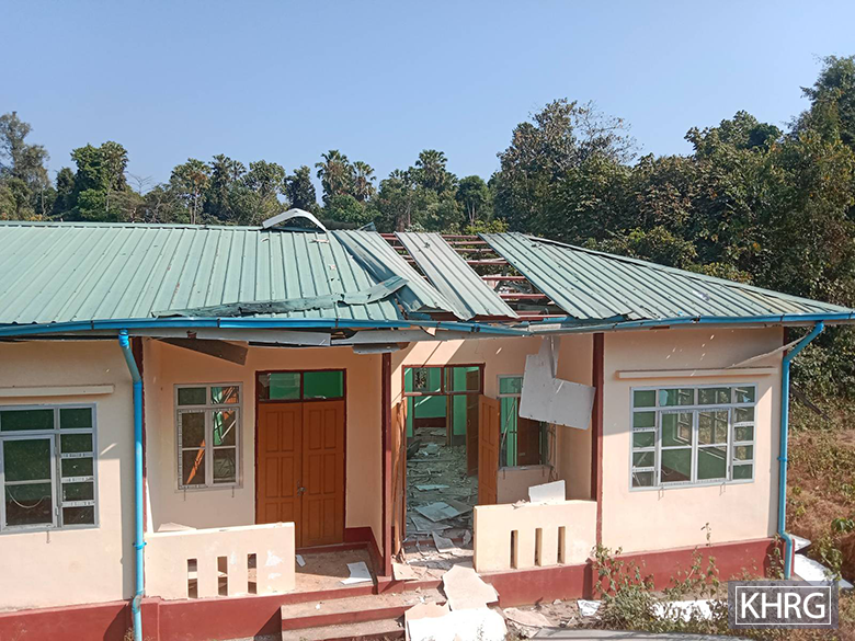 ဤဓာတ်ပုံကို ၂၀၂၅ ခုနှစ်၊ ဇန်နဝါရီလအတွင်း ဒူးသထူခရိုင်၊ ဘီး လင်းမြို့နယ်၊ တဂေးလောင်းကျေးရွာအုပ်စု၊ အဃ--- ကျေးရွာတွင် ရိုက်ယူခဲ့သည်။ ပုံတွင် ၂၀၂၅ ခုနှစ်၊ ဇန်နဝါရီလ ၁၆ ရက်နေ့၌ အဃ--- ကျေးရွာတွင် စစ်ကောင်စီဒရုန်းတိုက် ခိုက်မှုဖြစ်ပွားခဲ့သဖြင့် အ လယ်တန်းကျောင်းပျက်စီးခဲ့ရသည်။ ပုံတွင် စာသင်ကျောင်း၏မျက် နှာကျက်နှင့်သွပ်ခေါင်မိုးပျက်စီးသွားသောအခြေအနေကို ဖော်ပြထား သည်။ (ဓာတ်ပုံ- KHRG)