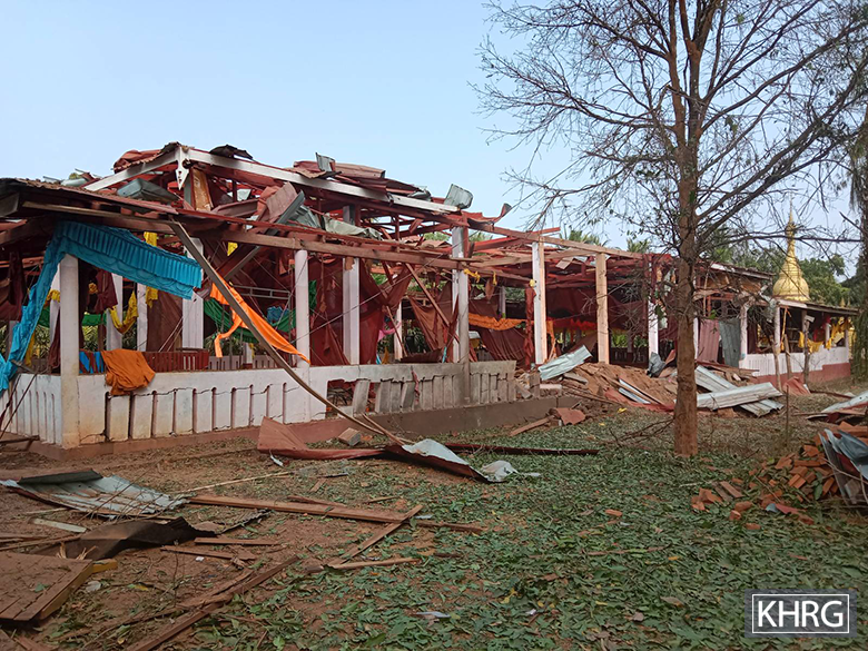 ဤဓာတ်ပုံများကို ၂၀၂၅ ခုနှစ်၊ ဖေဖော်ဝါရီအတွင်း ဒူးသထူခရိုင်၊ ဘီး လင်းမြို့နယ်၊ မင်းစောကျေးရွာအုပ်စု၊ အဃ--- ကျေးရွာတွင် ရိုက်ယူ ခဲ့သည်။ ၂၀၂၅ ခုနှစ်၊ ဖေဖော်ဝါရီလ ၉ ရက်နေ့တွင် စစ်ကောင်စီဂျက် လေယာဥ်တစ်စီးသည် အဃ--- ကျေးရွာတွင် ပေါင် (၅၀၀) ဗုံးနှစ်လုံး ပစ်ချ၍ ဘုန်းကြီးကျောင်းနှင့်လူနေအိမ်ငါးလုံးပျက်စီးပြီး ဆရာတော် နှစ်ပါးလည်း ထိမှန်ဒဏ်ရာရရှိခဲ့သည်။ ပုံတွင် ဗုံးပေါက်ကွဲမှုကြောင့် ကျေးရွာဘုန်းကြီးကျောင်း ပျက်စီးသွားသောအခြေအနေကို ဖော်ပြ ထားသည်။ (ဓာတ်ပုံ- KHRG)