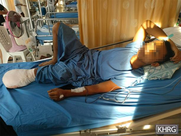 This photo was taken on May 29th 2022 of Saw Ab---, a 58-year-old villager from Ac--- village, Ler Muh Plaw village tract, Lu Thaw Township. On May 28th 2022 at 6 am, Saw Ab--- stepped on a landmine whilst travelling to his hill farmlands. The landmine had been planted by SAC soldiers from LIB #37. Saw Ab--- had lost his left leg back in 2011 from a landmine explosion, making this the second time he was injured by a landmine. In the most recent incident, he was injured on the same leg that had been amputated and sustained slight injuries on his other leg and his arms. The explosion damaged his prosthetic leg. He is now facing difficulties in earning a livelihood because of his injuries. He expressed his need of support from organisations that specifically provide aid to landmine victims. This photo shows Saw Ab--- recovering at a clinic from the injuries he sustained from the landmine explosion.[23] [Photo: KHRG]