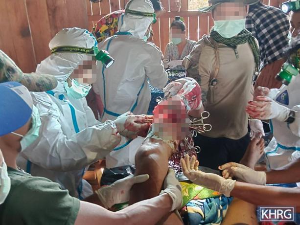 KHRG received this photo from a local healthcare worker on August 6th 2023. It shows 45-year-old Saw Q--- receiving treatment for his wounds after being injured by a landmine explosion. He was treated in Law Ma Thaw hospital where he received treatment from Karen Department of Health and Welfare (KDHW)[19]. On August 4th 2023 at 6:30 am, Saw Q---, from R--- village, Th’Myit Aye Kone village tract, Ler Doh Township, stepped on a landmine when he was visiting S--- village. His left leg was blown off and his right leg was injured as well. Saw Q--- has a wife and five children. This landmine was planted by the KNLA. [Photo: KDHW]