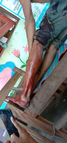 KHRG received these photos on February 4th 2023. On February 2nd 2023, a villager named Saw O--- from P--- village, Paw Pee Der village tract, Moo (Mone) Township, stepped on a landmine when he was travelling to his betel nut plantation in order to cut grass. He sustained injuries to his right leg and was sent to a hospital in Pyuh Town, Moo Township after the incident. KNLA Battalion #8, Company #3, from Brigade #3, planted this landmine in P--- village. These photos show Saw O--- injured, shortly after he stepped on the landmine. [Photos: Local villager]