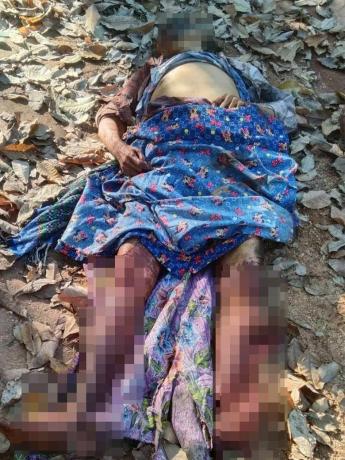These photos were taken on January 13th 2023 in G--- village, Than Moe Taung village tract, Daw Hpa Hkoh (Thandaunggyi) Township. They show the body of Daw[15] Hkin Win, a 68-year-old villager, who was killed by a landmine on January 13th 2023. The explosion happened on Than Moe Taung road in G--- village when she was returning home from collecting wood nearby, and stepped on the landmine. Her left leg was completely blown off below the knee and she sustained severe injuries to her right leg, her left arm and her face. The landmine was planted by SAC troops following armed clashes in the area.[16] [Photos: Local villager]